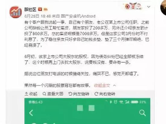 近日,微博大V“股社区”发消息称:某公司缺钱让员工帮忙集资,总集资规模数千万,但在今年3月,已难以付息,到6月初,其所持上市公司股份又因债务纠纷被冻结。
