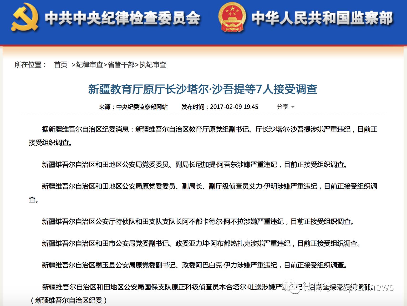 陈全国话音刚落,新疆纪委于9日宣布7名干部接受组织调查,其中6人来自和田与墨玉,且全部是公安系统的干部。随后中纪委网站转载了这条消息,警示意图不言而喻。