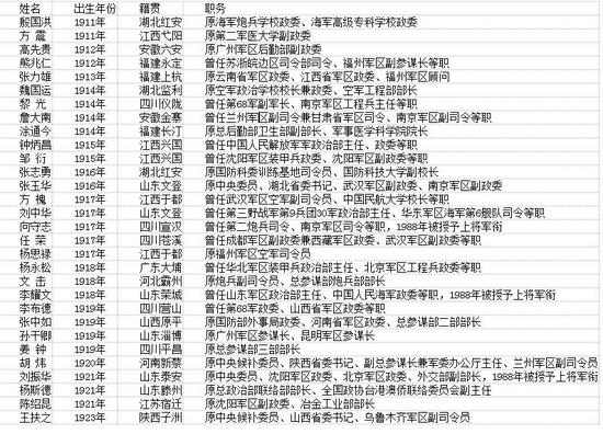 据统计,目前,1955年授衔的少将共有12人健在;1961年晋升少将的军官中尚有7人在世;1964年晋升少将的军官中健在者共有11人。