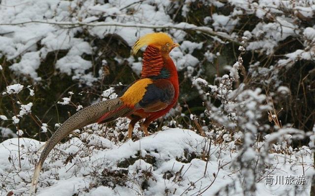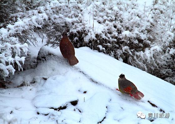在唐家河,我们还能看到绿尾虹雉、雪雉、红腹锦鸡、蓝马鸡.....或独来独往,或结伴而行,在雪地上漫步。它们像雪地上盛开的花朵,为苍茫的大地点缀了艳丽的色彩。