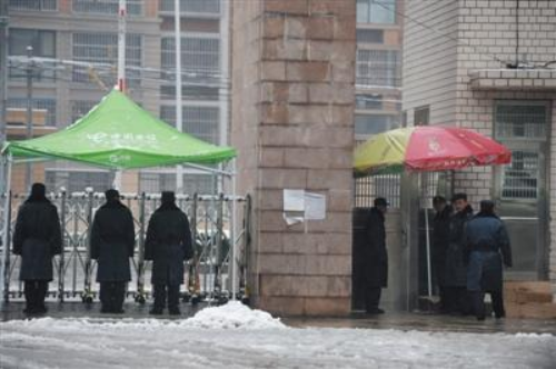 记者在该学校门前看到,10多名保安着装的人排成一排面朝大门外。另有穿保安制服的人看守过行人的小门,学生进出校门必须凭学生证通过。