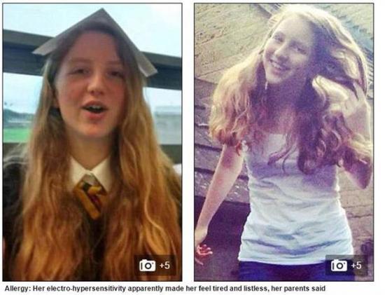 台 湾中时电子报12月1日援引英国《每日邮报》的报道称,年仅15岁的少女Jenny Fry自2012年开始表现出EHS的症状,会因为WiFi而感到头痛、疲惫、膀胱不适等…虽然Jenny的父母坚称她患有EHS,不过并未有就医纪录或 其他的医师证明。她的母亲向学校表示Jenny有此症状,导师却以“也有研究表示WiFi是安全无虞的”为由,拒绝移除校内WiFi,让少女于今年6月时 选择上吊轻生。