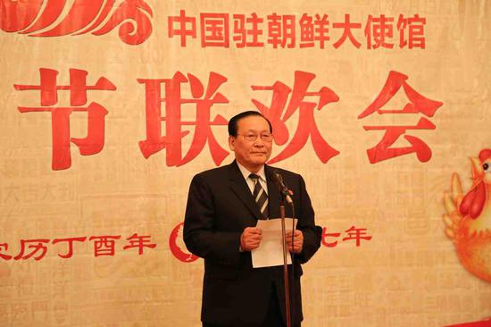 中国驻朝鲜大使李进军本月24日在平壤中国大使馆举行的“春节招待会”上讲话。来源:中国驻朝鲜大使馆网站1月24日,中国驻朝鲜大使李进军在使馆举行新春招待会。朝鲜最高人民会议常任委员会副委员长金英大率保健相兼朝中友协委员长姜河国、朝鲜劳动党中央国际部副部长李昌根、外务省副相李吉成、文化省副相金仁范、对外文委副委员长朴京日、外交团事业总局局长沈国龙等领导干部,以及朝鲜劳动党中央国际部、最高人民会议常任委员会、人民武力省、国家保卫省、人民保安省、外务省、对外经济省、对外文委等党政军各部门负责同志70余人参加。招待会由中国驻朝鲜使馆公使张承刚主持。
