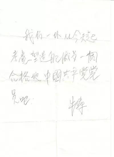 那份申请书牛犇写了几乎一整夜。申请书的很多内容的年份必须准确,牛犇困了,就在桌前趴着睡了两个钟头,凌晨三四点醒了,就继续写。“那大段的入党志愿是一气呵成的,没有打草稿。我自己都没有想到,写得这么顺,大概是这些话搁在心里大半辈子了。”