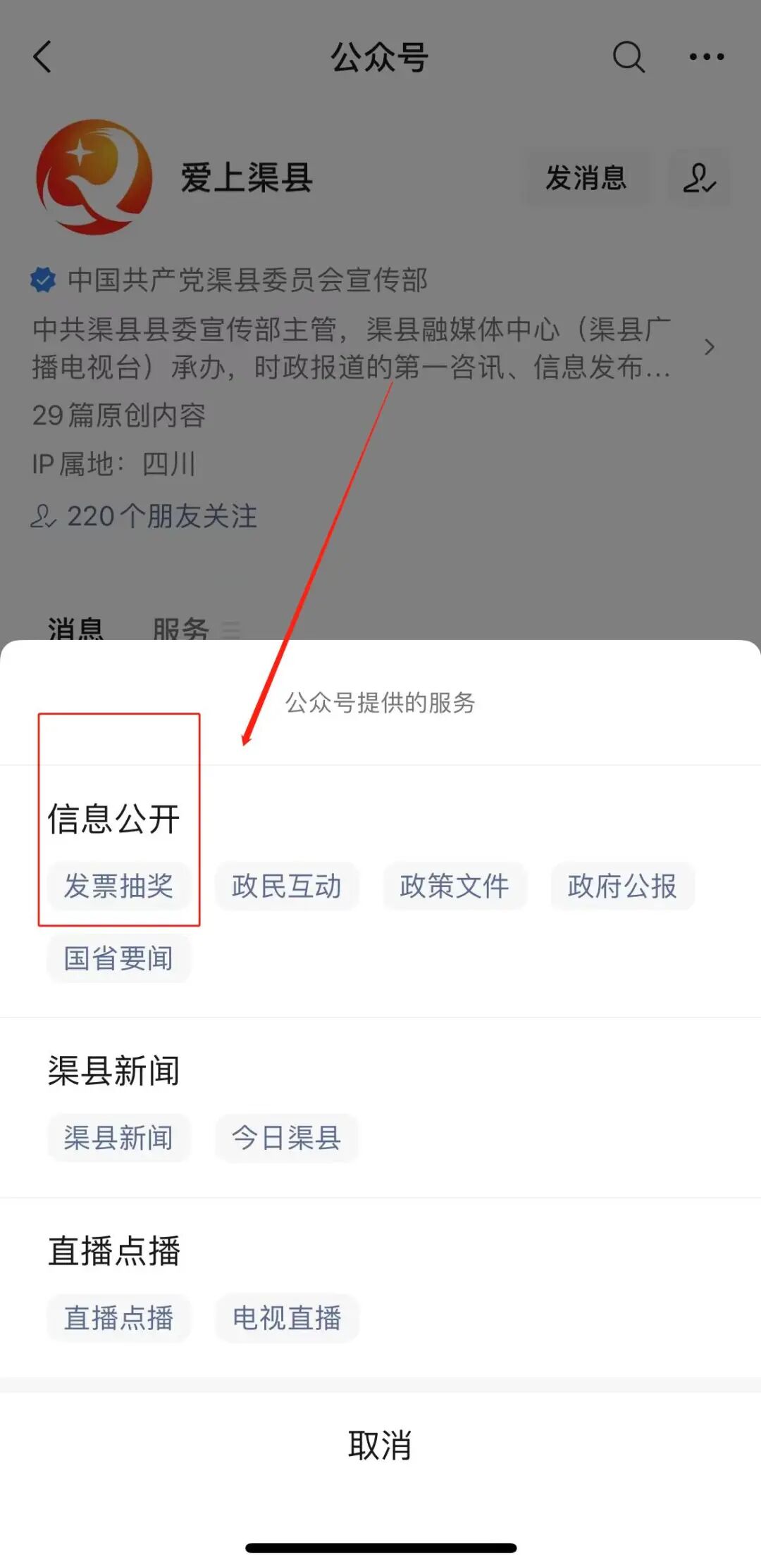 进入 爱上 渠县 主页 点击 上方服务版块 进入 发票抽奖