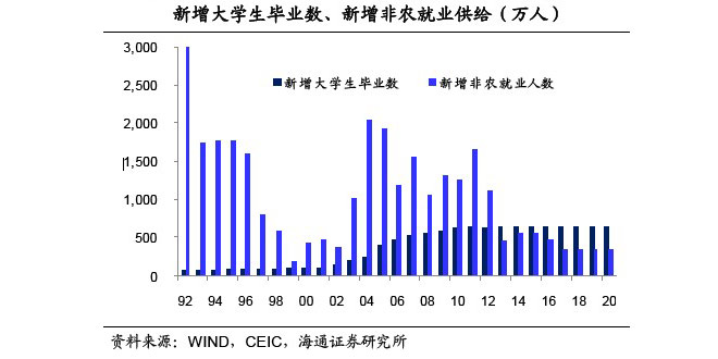 不过海通证券数据还显示,目前每年从农村转入的劳动力也有将近1400万,这意味着中国在未来一段时间内还能够保持城镇就业处于紧平衡状态。而且,即使中国经济增速减缓至6.5%左右,普遍担心的“就业”红线也不存在。