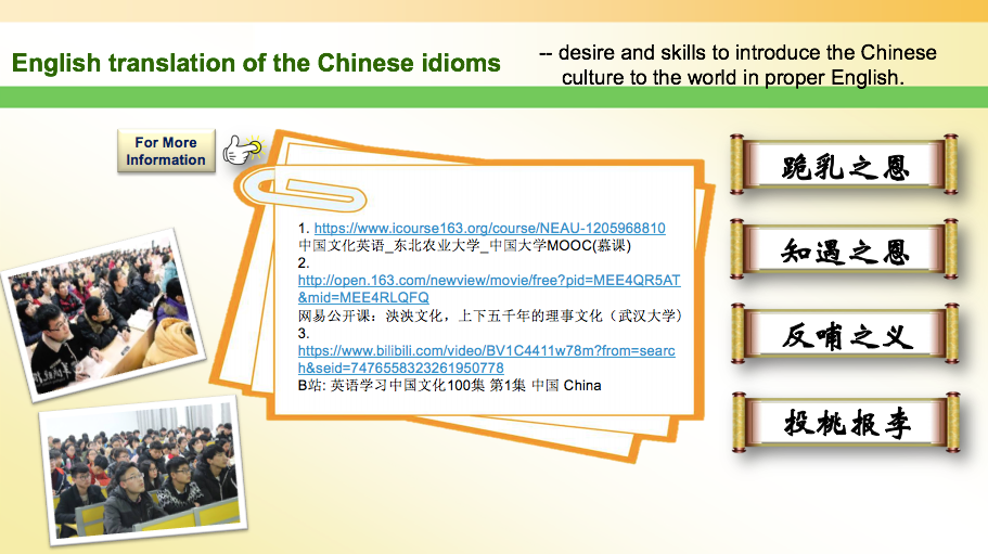 “从教学成果来看,学生们更加爱国了,也更加对我们的传统文化充满自信。”彭旭说。“如果我们的外语教学不重视意识形态和价值观问题,没有意识到内嵌于教学内容中的思想文化元素对学生的巨大影响力,那就无法回答‘培养什么人、怎样培养人、为谁培养人’这一问题。”李学芹说,“我们的学生有更多与外国人交流的机会,而我们要做的就是培养好他们,让他们讲好中国故事,为中华文化的发展与传播作出贡献。”