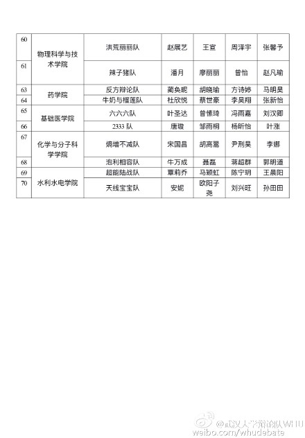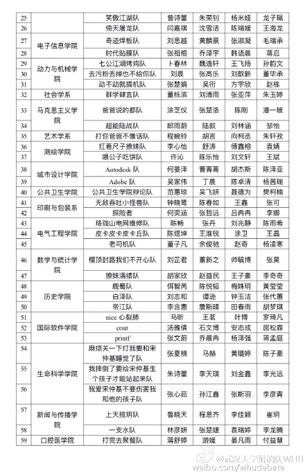 2016新生赛名单公示啦!(长微博排表格困难就发图片啦~)辩论队微博和艺协微信公众号都会发布哟!(来源:武汉大学辩论队微博)