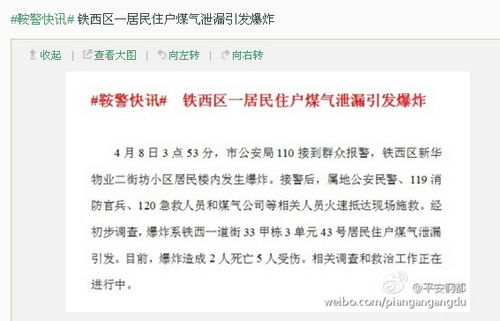 人民网北京4月8日电 (李楠楠)据辽宁省鞍山市公安局官方微博“平安钢都”消息,4月8日3时53分,市公安局110接到群众报警,铁西区新华物业二街坊小区居民楼内发生爆炸。接警后,属地公安民警,119消防官兵,120急救人员和煤气公司相关人员火速抵达现场施救。